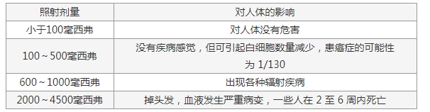輻射是無色、無味、無聲,看不見和摸不著的,但可用儀器來探測和度量。度量輻射劑量的單位是西弗(Sv),1西弗(Sv)=1000毫西弗(mSv)=1000000微西弗(μSv).放射線不同劑量照射對(duì)人體的影響不同,下表列出了放射線不同強(qiáng)度照射對(duì)人體的影響: