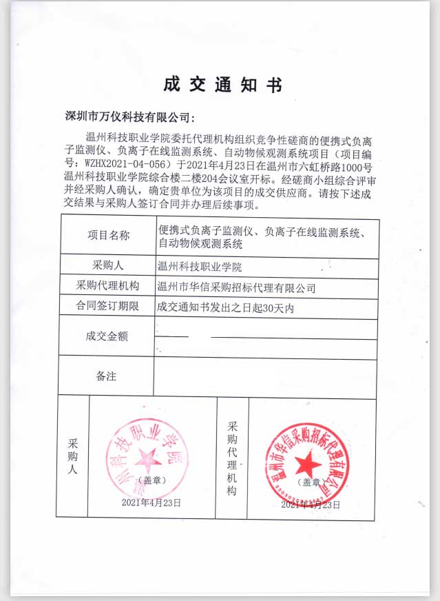 恭喜萬儀科技已中標,本次為溫州科技職業(yè)學院提供的設(shè)備型號為:ONETEST-503XP便攜式負氧離子監(jiān)測儀及ONETEST-500XP負離子自動觀測系統(tǒng),均為萬儀科技主打產(chǎn)品。