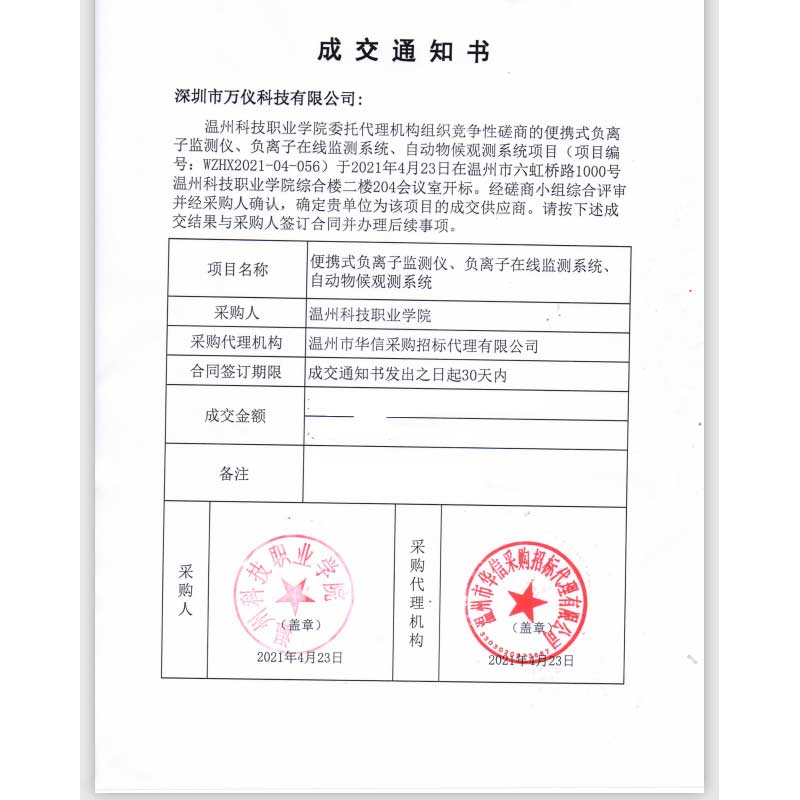 關(guān)于溫州職業(yè)技術(shù)學(xué)院便攜式負(fù)離子監(jiān)測儀招標(biāo)項目恭喜萬儀科技已中標(biāo),本次為溫州科技職業(yè)學(xué)院提供的設(shè)備型號為:ONETEST-503XP便攜式負(fù)氧離子監(jiān)測儀及ONETEST-500XP負(fù)離子自動觀測系統(tǒng),均為萬儀科技主打產(chǎn)品。 深圳市萬儀科技有限公司16年來兢兢業(yè)業(yè)深耕負(fù)離子測量儀器...MORE -